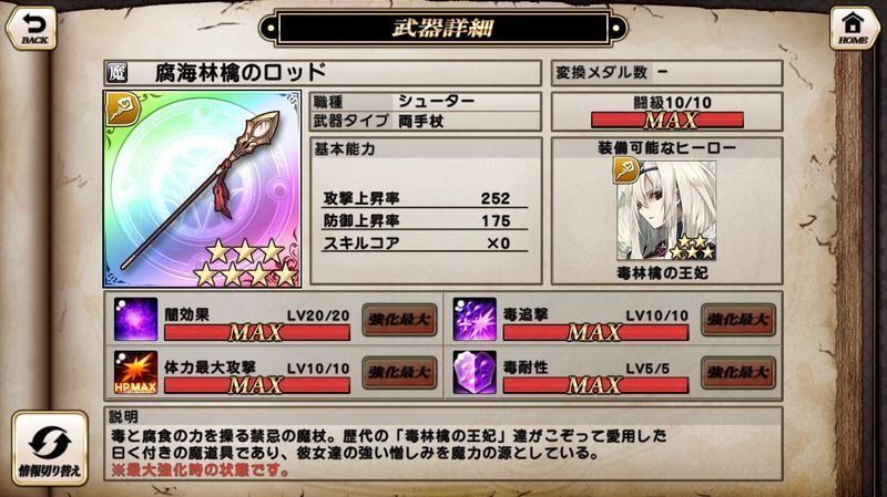 | スキル | 闇効果/毒追撃/体力最大攻撃/毒耐性 |