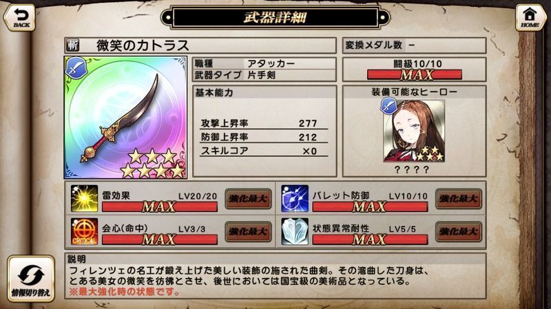 | スキル | 雷効果/会心(命中)/バレット防御/状態異常耐性 |