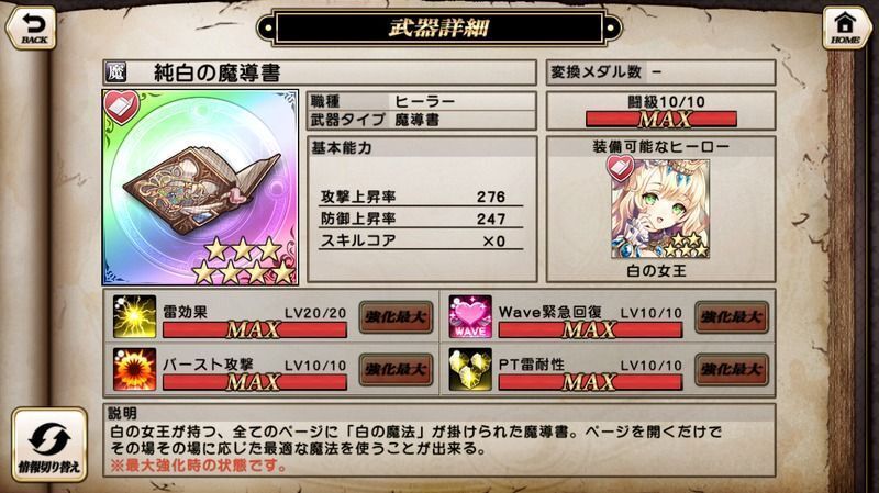 | 雷効果・・・雷属性の攻撃力が60%増加します。 バースト攻撃・・・爆発攻撃のダメージが50%増加します。 Wave緊急回復・・・2Wave目以降、Wave開始時に、一番HPの少ないヒーローのHPを50%回復します。 PT雷耐性・・・パーティ全員が、雷属性を含む攻撃に対して、防御力が50%増加します。 | |