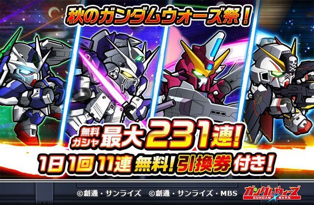 | 秋のガンダムウォーズ祭!引換券付き1日1回11連無料ガシャフェスティバル | 2025年9月11日 0:00 | 2025年10月1日 23:59まで |