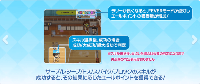 サーブ/レシーブ/トス/スパイク/ブロックのスキル成功に応じてエールポイントを獲得することができます。スキル選択後、成功/大成功/超成功で判定されます。