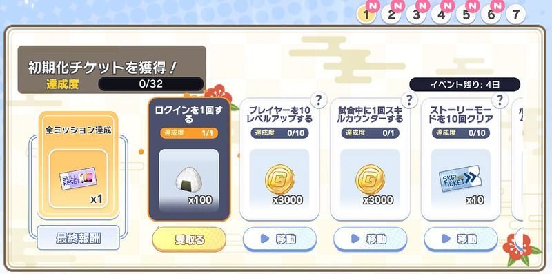 3日目のミッションをクリアすると「レベル初期化チケット」、全てのミッションをクリアすると「スキル初期化チケット」が獲得できます