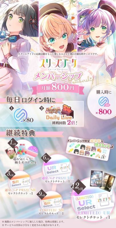 | 継続3ヶ月 | メンバーシップ【スリーズブーケ】 特典SRセレクトチケット(通常のみ) ×1 |