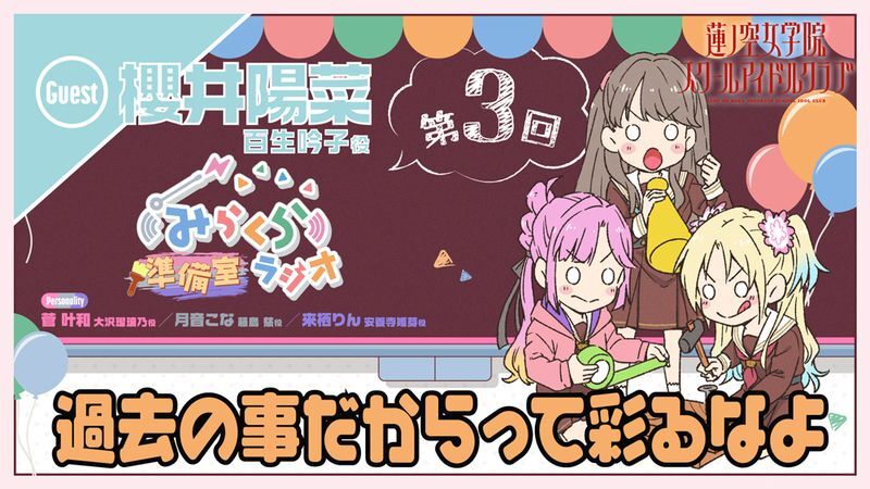 大沢瑠璃乃役の菅叶和、藤島慈役の月音こな、安養寺姫芽役の来栖りんの3人による、「みらくらぱーく!公開録音」へ向けて着々と準備を進めるためのウェブラジオです。