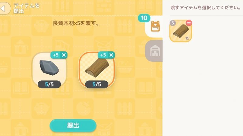 | 8 | ![]() 同じく斧で近くの岩から石を10個採集する ┗こちらも一定量採集するとしばらく採集できなくなるので他の岩から採集する |