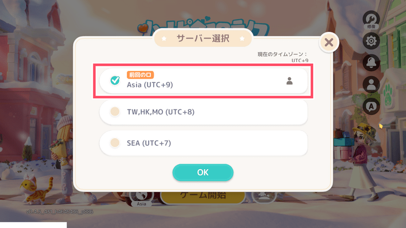 『ハートピアスローライフ』をインストールし、ゲームを始める際、基本的には「アジア(Asia)」サーバーが選択されている状態になっているのでそのまま始めて問題ありません。