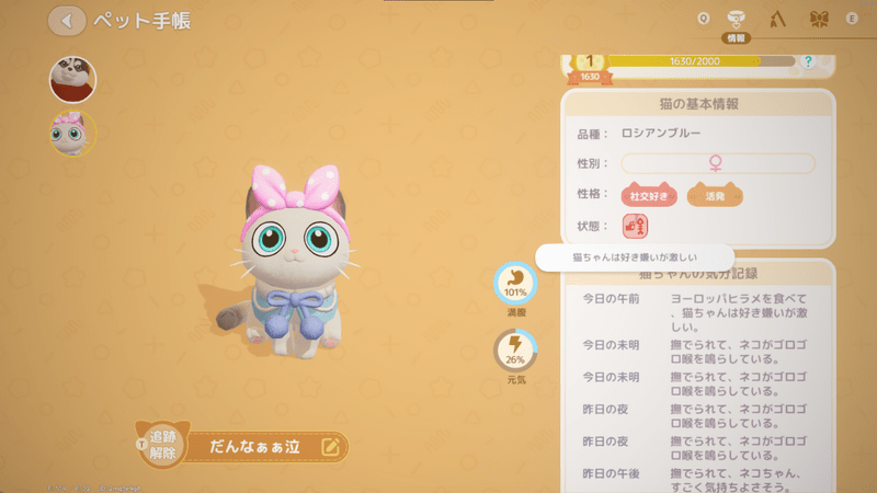 猫は2つの性格をランダムで持ちます。左側がメイン性格で、右側がサブ性格となっています。