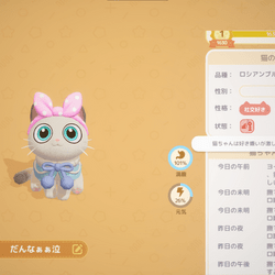 猫の見た目(毛並みや目の形)はランダムです。茶トラやミケ猫タイプ、ロシアンブルーなど、中にはレア種としてパンダやアライグマみたいな毛並みもあります。ペットショップを定期的に訪れ、好きな見た目の猫がいるかチェックしてみましょう。