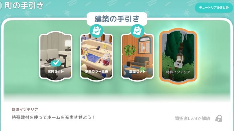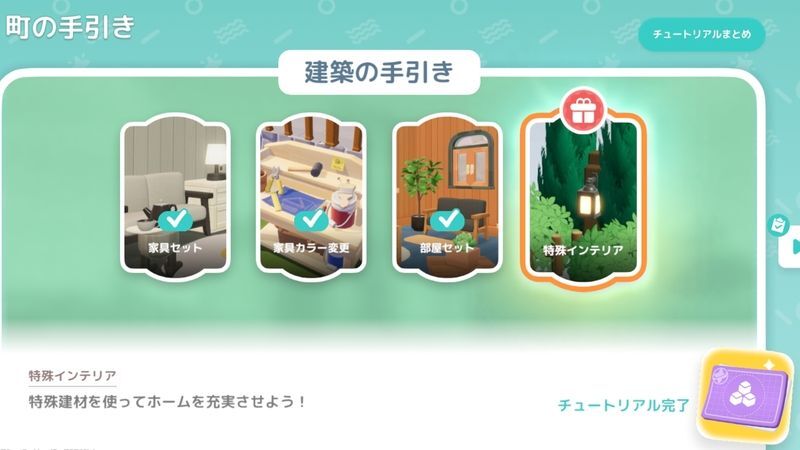 任務が完了したら、もう1度町の手引きを開き、「チュートリアル完了」をタップして報酬を受け取りましょう。報酬は「草木と花のささやき」セットです。セット内容の建材は特殊インテリア商店で購入する必要があります。