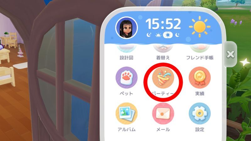 | 3 | ![]() 腕時計メニューからパーティを選び「お茶会」を開始する ┗実際にフレンドとパーティしなくても1人で準備段階でOK |