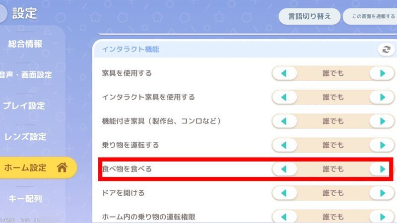 腕時計メニューの「設定」を開き、「ホーム設定」の「食べ物を食べる」が自分のみになっている場合、誰でもに変更することで、フレンドも料理を食べることができます。