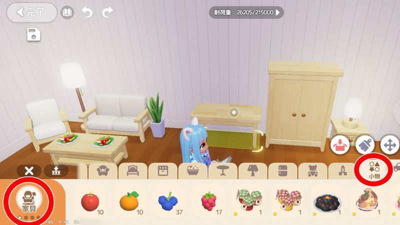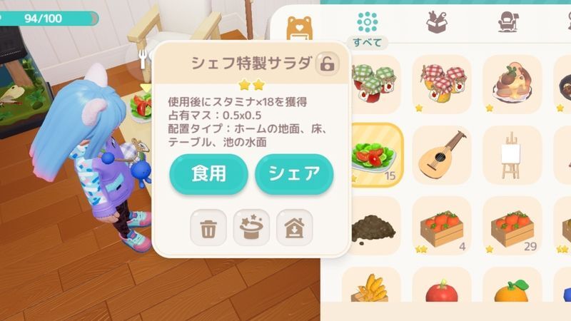 | 2 | ![]() ホームに戻り、来客用のおもてなし料理を3品並べる ┗コンロで料理を3つ製作する。報酬でもらったシェフ特製サラダでもOK ![]() ┗建築モードに入る ![]() ┗「家具」→「小物」から製作した料理を3つ配置する |
