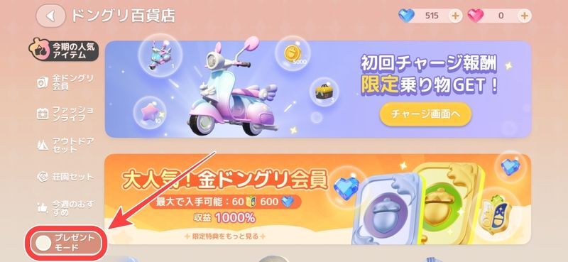 ドングリ百貨店の画面左下にあるプレゼントモードをタップすると、プレゼントで贈るアイテムを購入することができます。