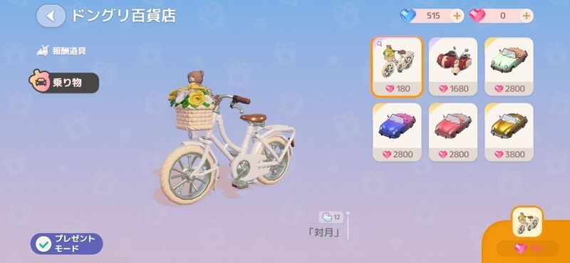 プレゼントできるアイテムは具体的に「報酬道具」「乗り物」の2つです。もちろんプレゼントなので自分が購入した後に相手に送ることができます。