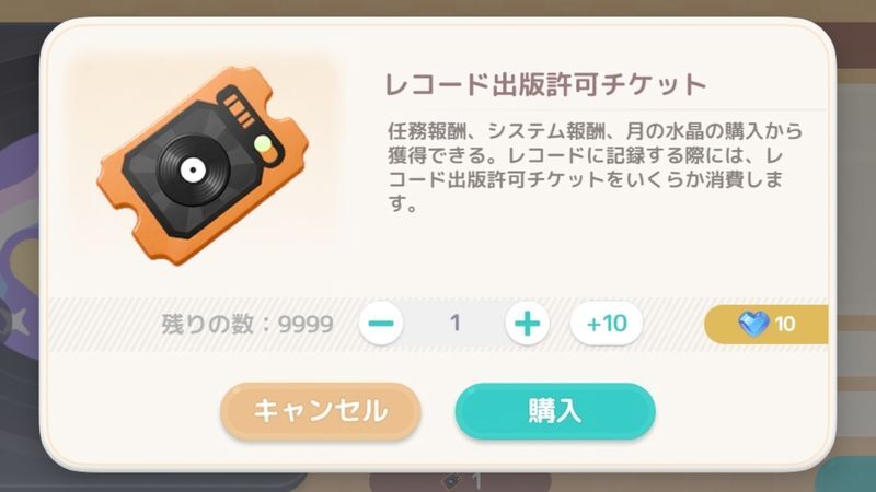 レコードにするにはレコード出版許可チケットが必要です。1枚につき月の水晶10個で購入できます。