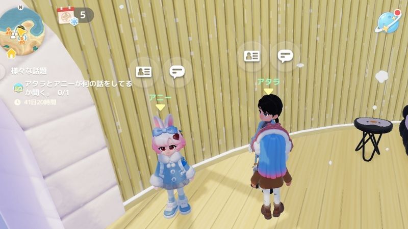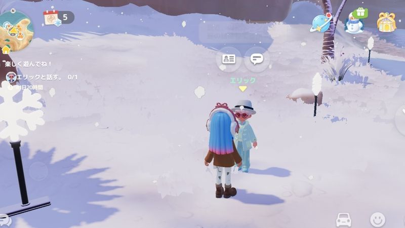 | 7 | ![]() 「スノートレンドを感じる」達成のため、以下の「スノーシーズンイベント」をクリアする ・ヴァンニア(謎の氷晶の魚) ・マッシモ(オーロラディナー) ・ブランク(雪植え) ・ハリー(アイススケート) ・エリック(雪だるま作り) ・アタラ(音楽会) ・アズール(トレンド商店オープン!) ・ノーティー(温泉卵の約束) ▶スノーシーズンイベントの進め方 |