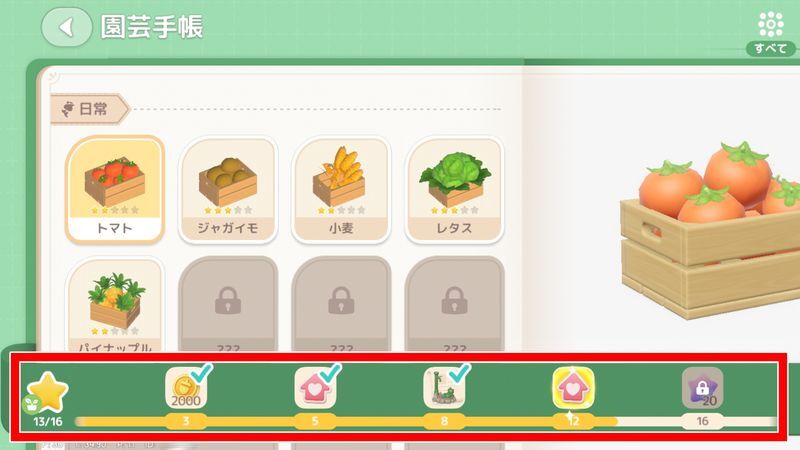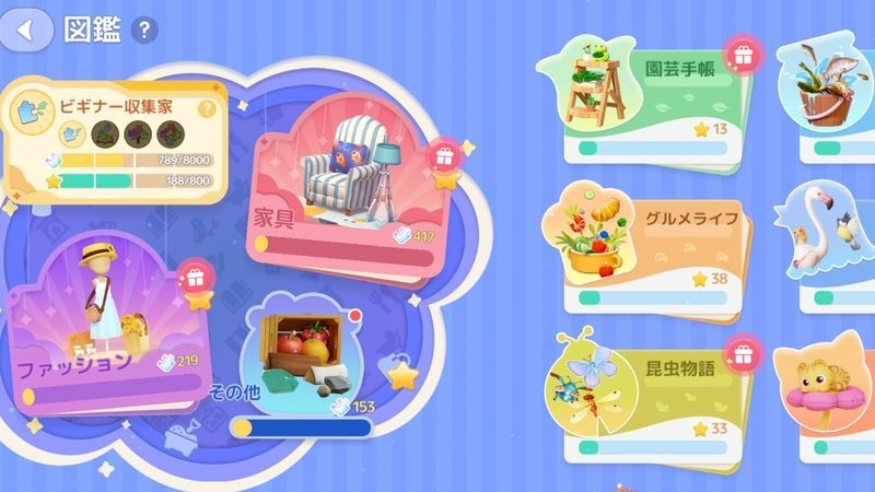 園芸手帳、魚観察、グルメライフ、野鳥観察日記、昆虫物語、ネコタイム、ワンコタイムの図鑑のスタースコアはそれぞれ、園芸農作物、魚、料理、野鳥、昆虫、猫の仕草、犬の仕草の初めて獲得した品質により獲得します。