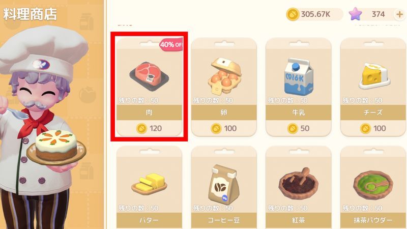 マッシモは日替わりで食材のセールを行なっているので、安い時に上限まで購入しておくと良いでしょう。お金に余裕がある場合は毎日肉とバターを買い、大根おろし肉をクッキングで作りましょう。作った料理は倍額買取時に販売しましょう。