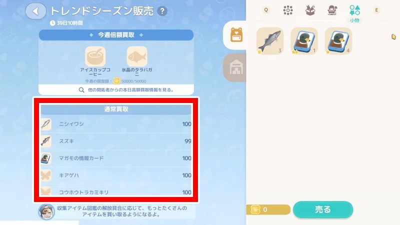 スズキなど一般的な収集品は売却できる数に限りがありますが、「氷晶のフグ」などのイベント限定収集品には制限がありません。そのため、トレンドコインを大量に集める場合はイベント収集品を集めて売却するのが良いです。
