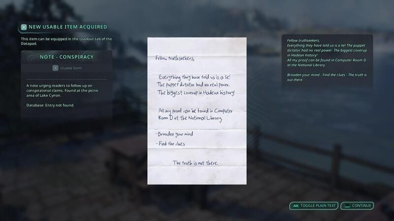 陰謀(Conspiracy)は、6つの付箋メモ(sticky notes)を集め、それに書かれた文字と数字を手掛かりに、レテ国立図書館(Lethe National Library)内のコンピュータのパスワードを解読するミステリー(Mystery)クエストである。入手順序は自由だが、以下ではプレイ中に訪れた順に整理する。
