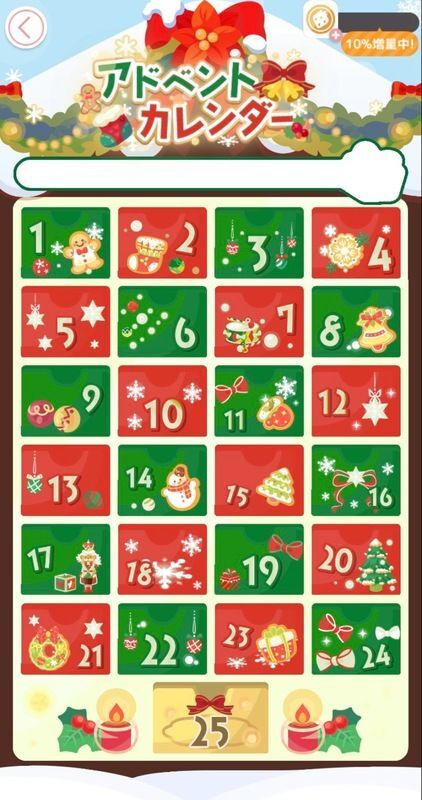 - 12月25日当日にログインしても期間中20日以上ログインされなかった場合は、25日の報酬はもらうことができません。