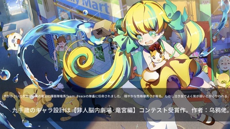 | 四海の竜王に、竜馬護衛隊Team:Peaceの隊長に任命された少女。 穏やかな性格と優秀さが有名、しかし泣き虫でよく気が小さいとからかわれる。 九千歳のキャラ設計は【非人脳内劇場・竜宮編】コンテスト受賞作。作者:鸟鸦佬 | |