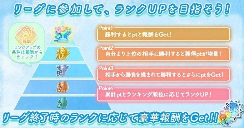 勝利すると獲得できるポイントに応じてランクが上がっていき、上位ランクになる程リーグ終了時に獲得できる報酬が豪華になっていきます。