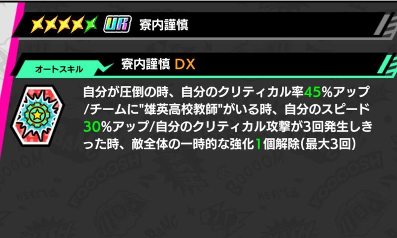 ・寮内謹慎は自分が圧倒状態の時クリティカル率をアップし、雄英高校教師がいればスピードを上げてくれるメモリーとなっている。