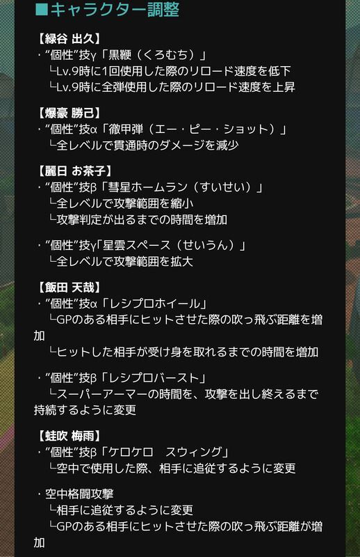 2023/11/24のアプデにてバグの修正やキャラクターの能力調整が実施。
