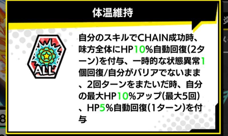 ・オートスキルのチェイン成功時にHP10%回復は2ターン継続するため、2ターン目には最大20%もの回復が可能だ。