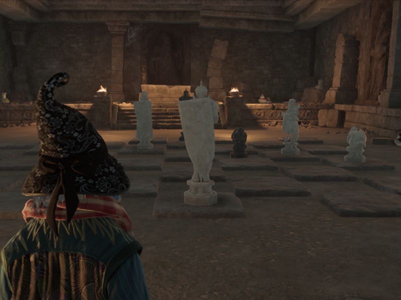 周囲のオブジェクト(レベリオで確認できる)を変身術で駒にして、台座側の黒い駒にかかるよう運ぶと宝箱が出現します。