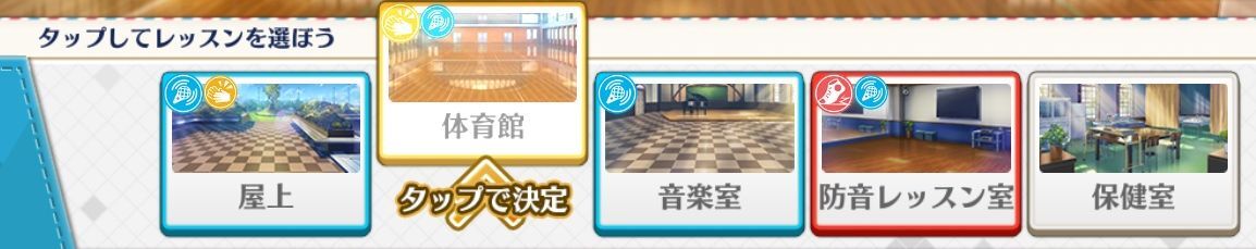 レッスン場所とアイドルの属性が同じだと効果がアップします。またフィーバー中は通常の倍以上を獲得できます。