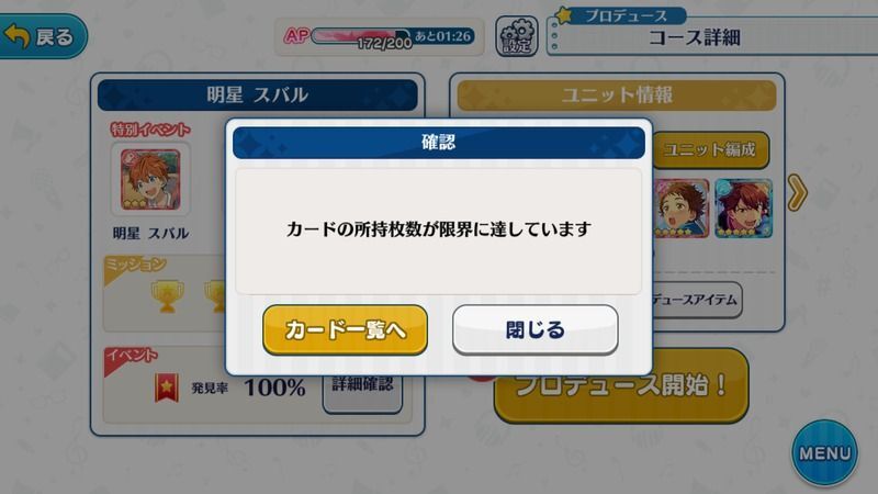 手持ちのカード所持数には上限があり、上限を超えると期間限定イベントのライブや、プロデュースが実行できなくなるなど制限が発生します。