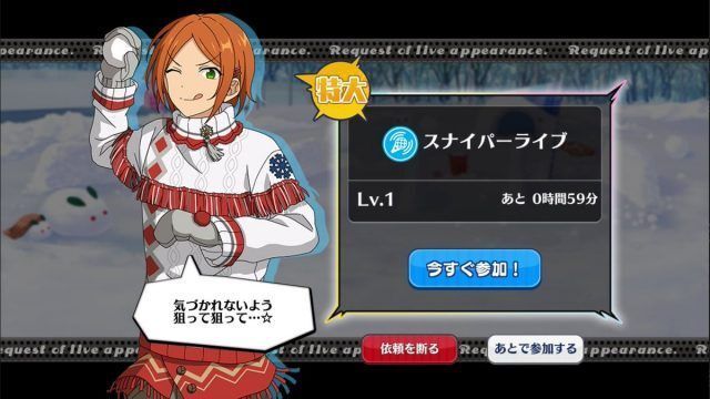 | 通常ライブ、特大ライブを無事達成すると、一定の確率で発生。 |