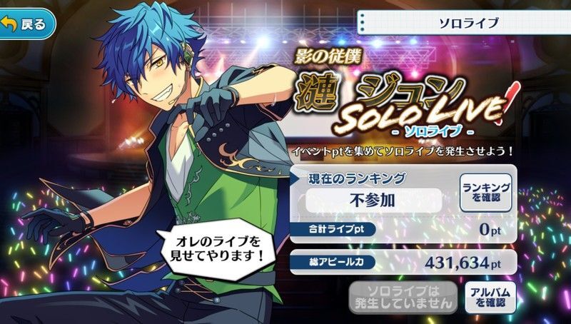 | ソロライブで獲得したライブptによりアイドル毎のソロランキングが決定するが、ランキング報酬はない。 全アイドルのソロランキングの最終結果はユニットコレクション終了後も常に確認できる。 |