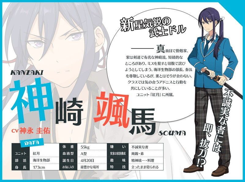 | 真面目で勤勉家。家は剣道で有名な神崎流。短絡的なところがあり、ミスを犯すと切腹で詫びようとしてしまう。海洋生物部の部長、奏汰を尊敬しているが、薫とはそりが合わない。 クラスでは気の合うアドニスと行動を共にしていることが多い。ユニット『紅月』に所属。 | |