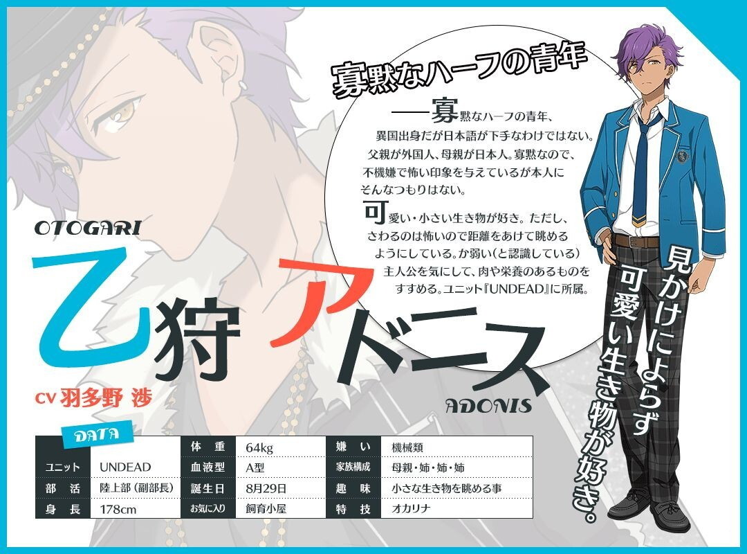 | 寡黙なハーフの青年、異国出身だが日本語が下手なわけではない。父親が外国人、母親が日本人。寡黙なので、不機嫌で怖い印象を与えているが本人にそんなつもりはない。 可愛い・小さい生き物が好き。ただし、さわるのは怖いので距離をあけて眺めるようにしている。 か弱い(と認識している)主人公を気にして、肉や栄養のあるものをすすめる。ユニット『UNDEAD』に所属。 | |