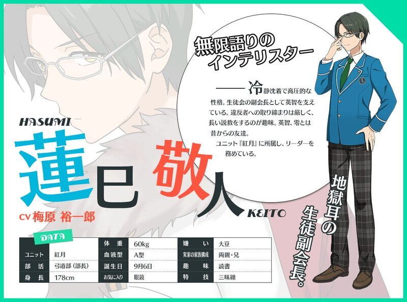 | ①テキパキ仕事をこなす敏腕副会長。地獄耳。朔間零とは入学以前からの友人。 ②生徒会長の右腕。高圧的な態度で、長い話を好む。地獄耳。 | |