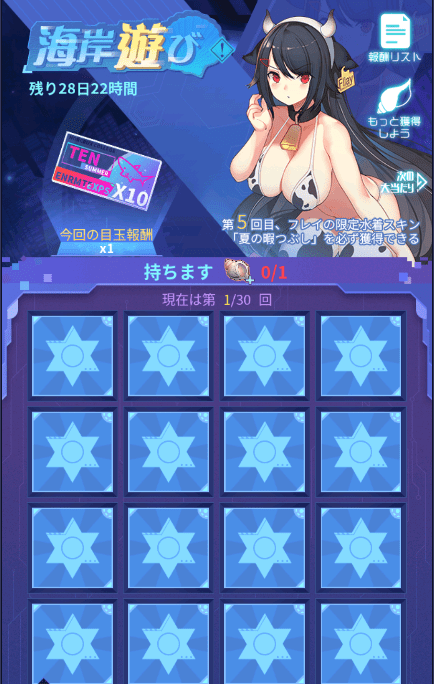 サインインや「心涼しき夏」の報酬で集めたサザエを使って、「海岸の遊び」でパネルを開けて行きましょう。パネルを開けるとそこに隠されたアイテムを獲得することができます。