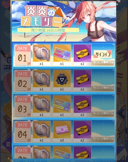 「夏のトキメキ☆-激浪盛夏」のイベントページから1日毎にサインインすることで、報酬を受け取ることができます。