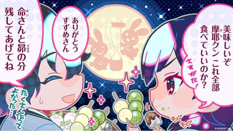 | 青木 摩耶が作ったお団子をほおばる朱藤 すずめ お月見を楽しんでいる様子です | |