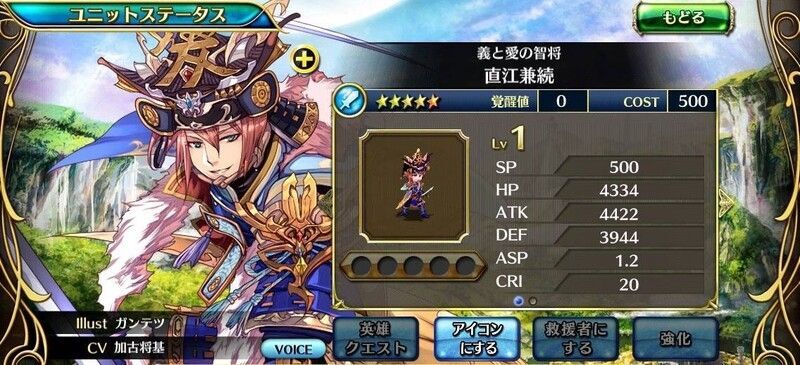 | 【義と愛の智将】直江兼続【★4】→【義と愛の智将】直江兼続【★4:進化1】→【義と愛の智将】直江兼続【★5】 | |