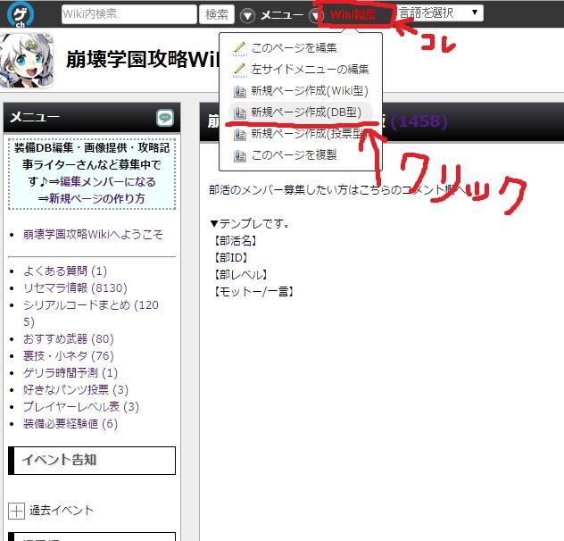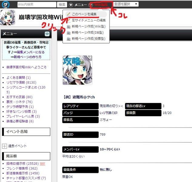 - 1.wikiページの一番上にあるWiki編集ボタンをクリックする(崩壊Wiki内ならどのページからでもOK)