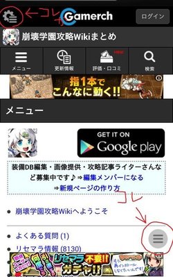 - 1.wikiページの一番上にあるアイコンか右下の丸いアイコンをタップする(崩壊Wiki内ならどのページからでもOK)