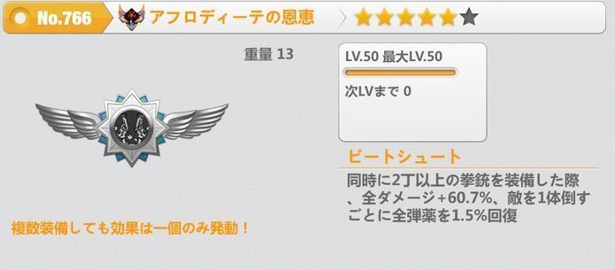 同時に2丁以上の拳銃を装備した際、全ダメージ+46%(60.7%)、敵を1体倒すごとに全弾薬を1.5%回復