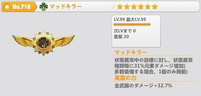 状態異常中の目標に対し、状態異常種類毎に18.26%(31%)元素ダメージ増加(多数装備する場合、1個のみ発動)