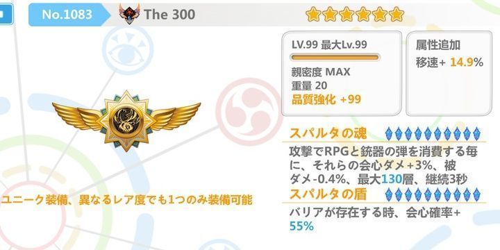 攻撃でRPGと銃器の弾を消費する毎に、それらの会心ダメ+2.02%(+3%)、非ダメ-0.25%(-0.4%)、最大80層、継続3秒