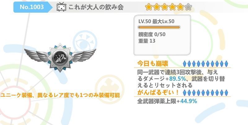 同一武器で連続3回攻撃後、与えるダメージ+40%(+64.5%)、武器を切り替えるとリセットされる