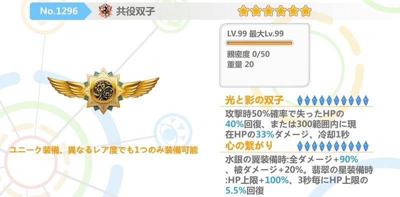 水銀の翼装備時:全ダメージ+50.4%(+70%)、被ダメージ+20%。翡翠の星装備時:HP上限+60.2%(+70%)、3秒毎にHP上限の4%回復