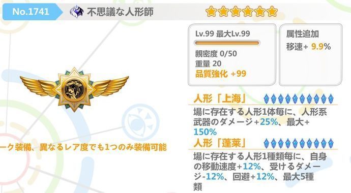場に存在する人形1種類毎に、自身の移動速度+5.1%(+10%)、受けるダメージ-5.1%(-10%)、回避+5.1%(+10%)、最大5種類